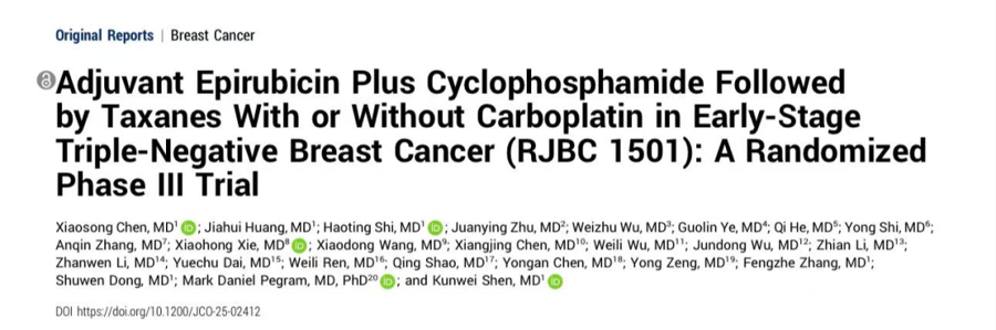 2015年,经过8年的前期铺垫,编号为“RJBC1501”的研究正式启动。这是一项由沈坤炜主任作为主要研究者牵头开展的全国多中心、前瞻性、随机对照III期临床研究,联合全国19家医院共同参与,最终纳入786例早期三阴性乳腺癌患者。研究将患者按1:1比例随机分为两组,一组接受传统EC-T标准辅助化疗方案(表柔比星+环磷酰胺序贯紫杉类药物),另一组采用“瑞金方案”(EC-TCb方案,即在标准方案基础上加用卡铂),旨在验证铂类药物在辅助治疗中的临床价值。