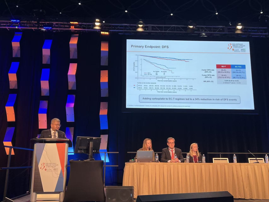 根据中位随访4.52年的结果显示,“瑞金方案”展现出卓越的临床疗效:加用卡铂后,显著降低三阴性乳腺癌术后复发风险34%,死亡风险61%,手术后3年无复发生存率为93.1%,无远处转移生存率为95.2%,总生存率达98.3%。并且,这个方案适用于绝大部分可手术的三阴性乳腺癌患者,加用铂类药物并未显著增加毒副反应,从而进一步支持了这一方案的有效性与安全性。