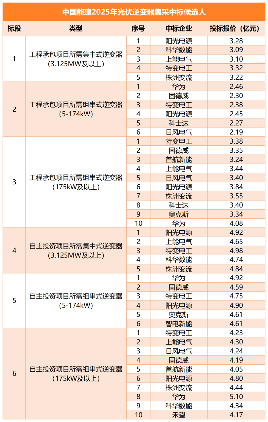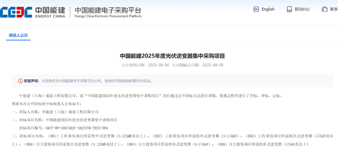 8月6日,中国能建2025年度光伏逆变器集中采购项目中标候选人公布,集采规模20GW。
