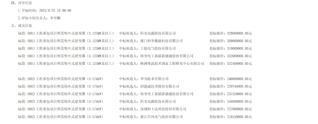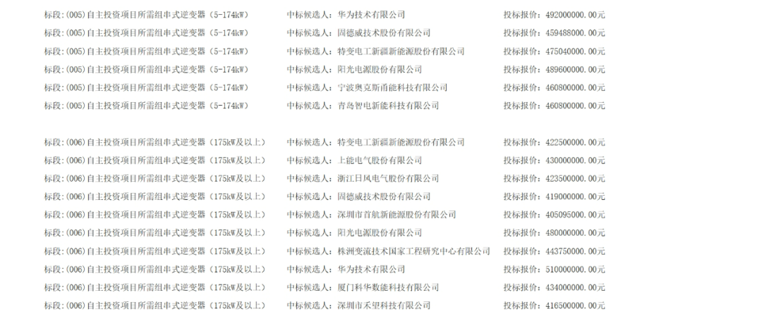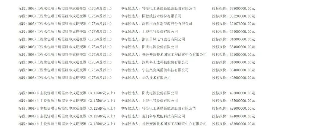 阳光电源、华为、特变电工预中标。其中,阳光电源位列一标段、四标段第一中标候选人,华为是二标段、五标段第一中标候选人,特变电工为三标段、六标段第一中标候选人。